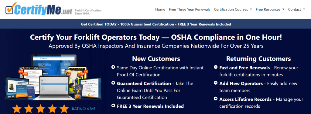 CertifyMe.net has offered online forklift certification since 1999. With Our Convenient online program. your employess can earn their certification in an hour or less.